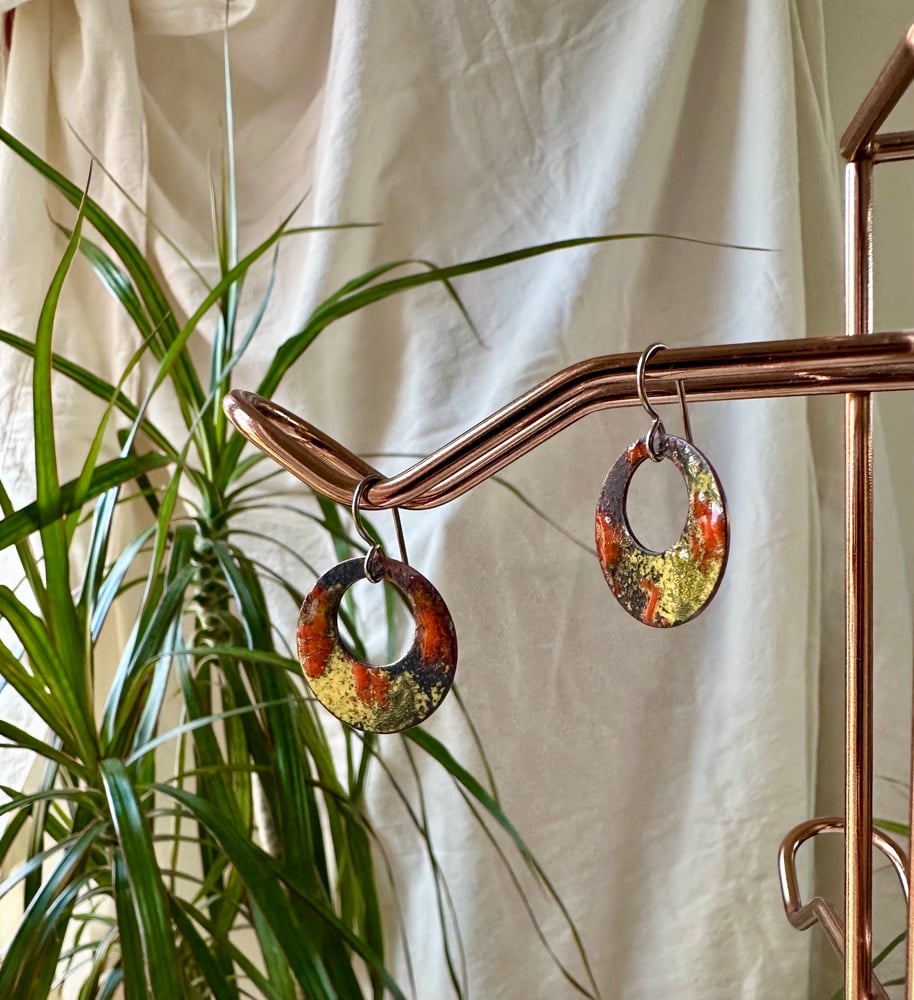 Enamelled copper earrings with red/orange splatter design